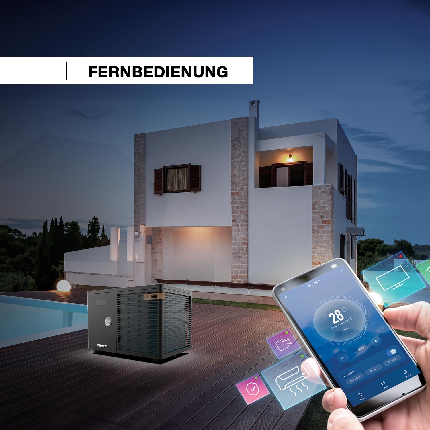 Die JET CITY Wärmepumpe verbindet sich direkt mit Ihrem Wi-Fi und lässt sich vollständig über die POOLEX-App fernsteuern. Greifen Sie auf alle Einstellungen Ihrer Pumpe über Ihr Smartphone zu, passen Sie Parameter wie Wassertemperatur an oder programmieren Sie Heizzyklen, um Energie zu sparen. Sie erhalten auch Benachrichtigungen und Alarme für eine optimale Überwachung Ihrer Ausrüstung.